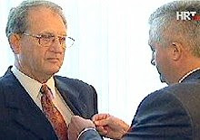 Croatian defense minister Pavao Miljavac (right) decorated MPRI executive director Major General Richard Griffits with the Order of the Croatian Clover in recognition of his contributions to helping Croatia create its own armed forces.